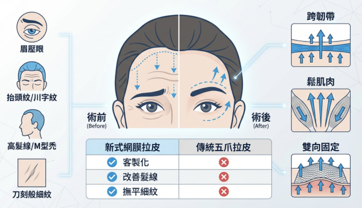 A:最大的差別在於「固定方式」與「客製化程度」。傳統五爪拉皮使用固定位置的倒鉤,拉提範圍受限且可能造成髮際線後移;新式技術則利用 Mesh 生物網膜,可隨意調整傷口位置與拉提方向,不僅能解決老化,還能同步改善 M 型禿或髮際線不對稱問題。