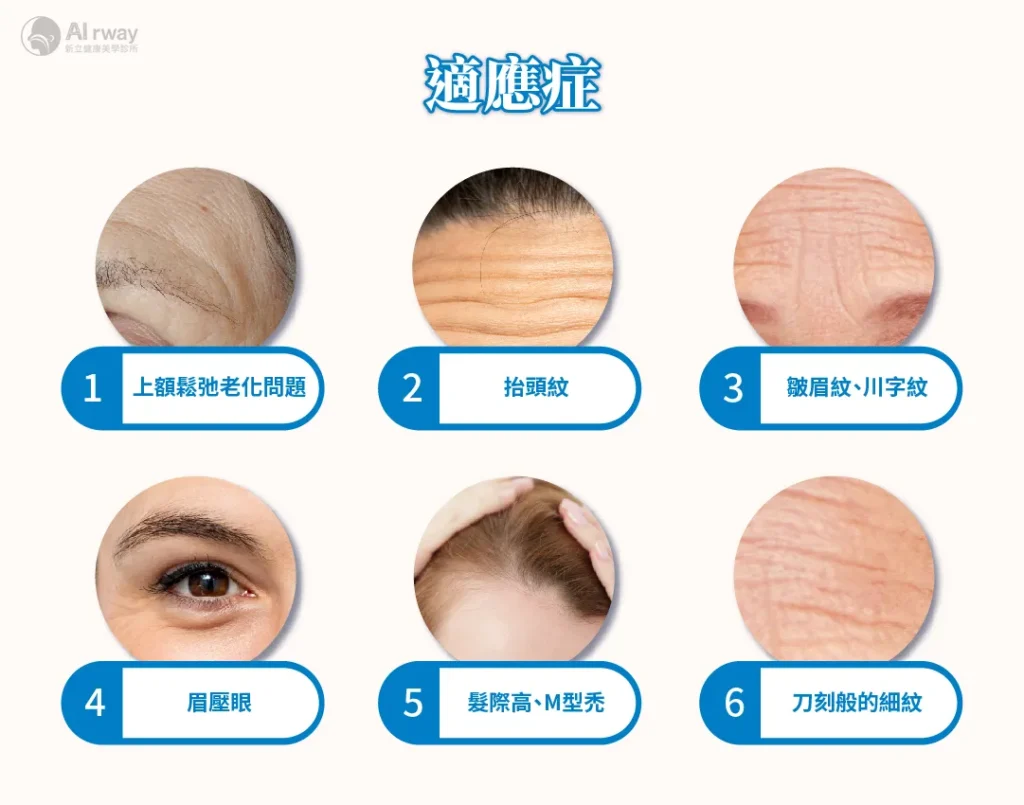 | 針對老化問題 | 解決眉壓眼、抬頭紋、川字紋、眼尾下垂及刀刻般深層細紋。 |